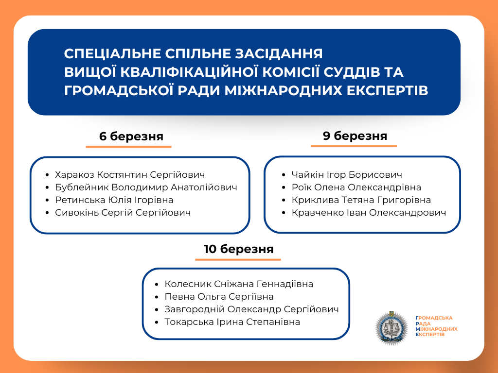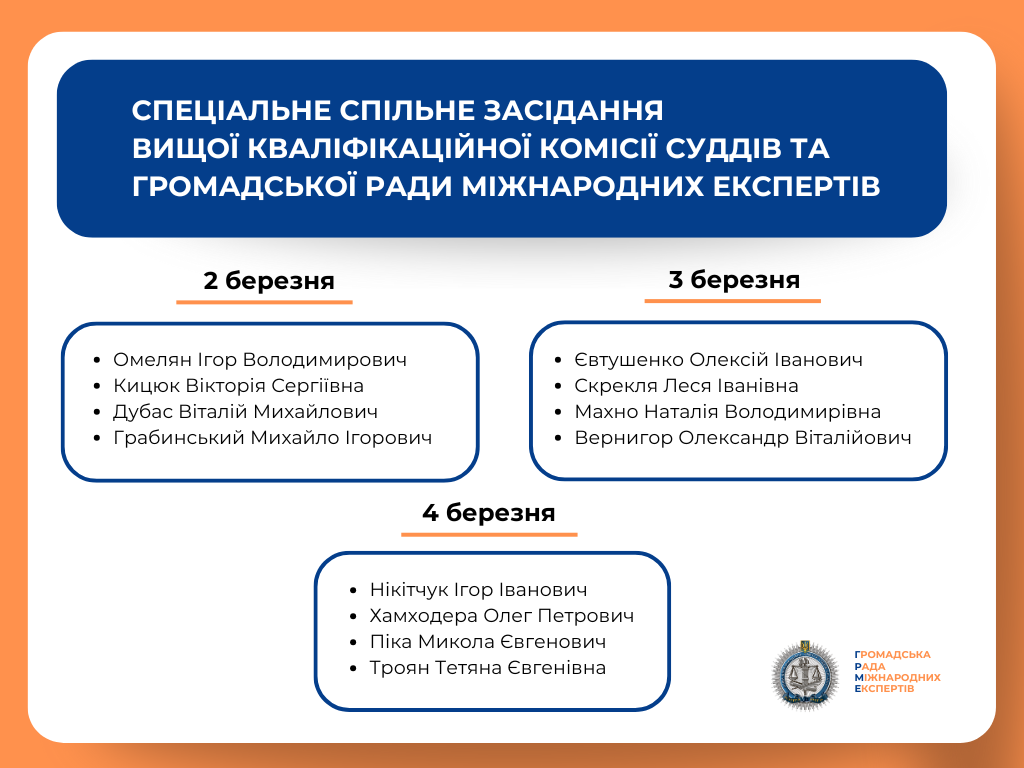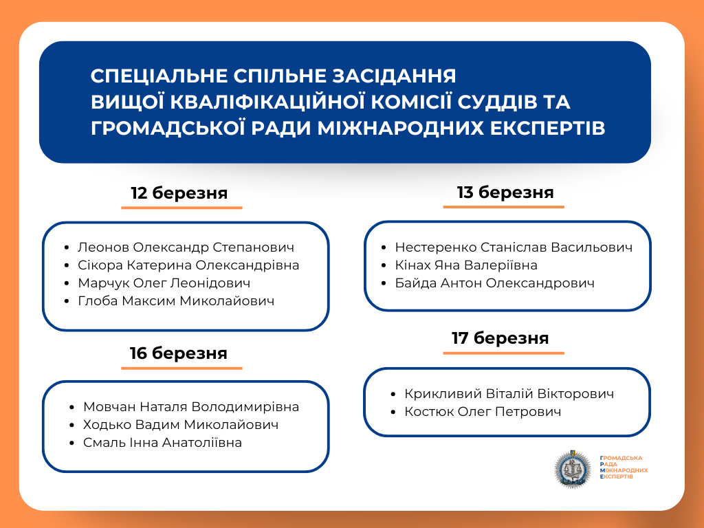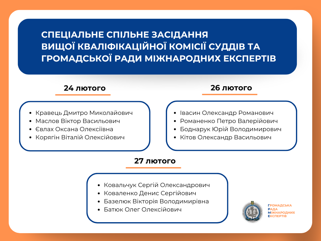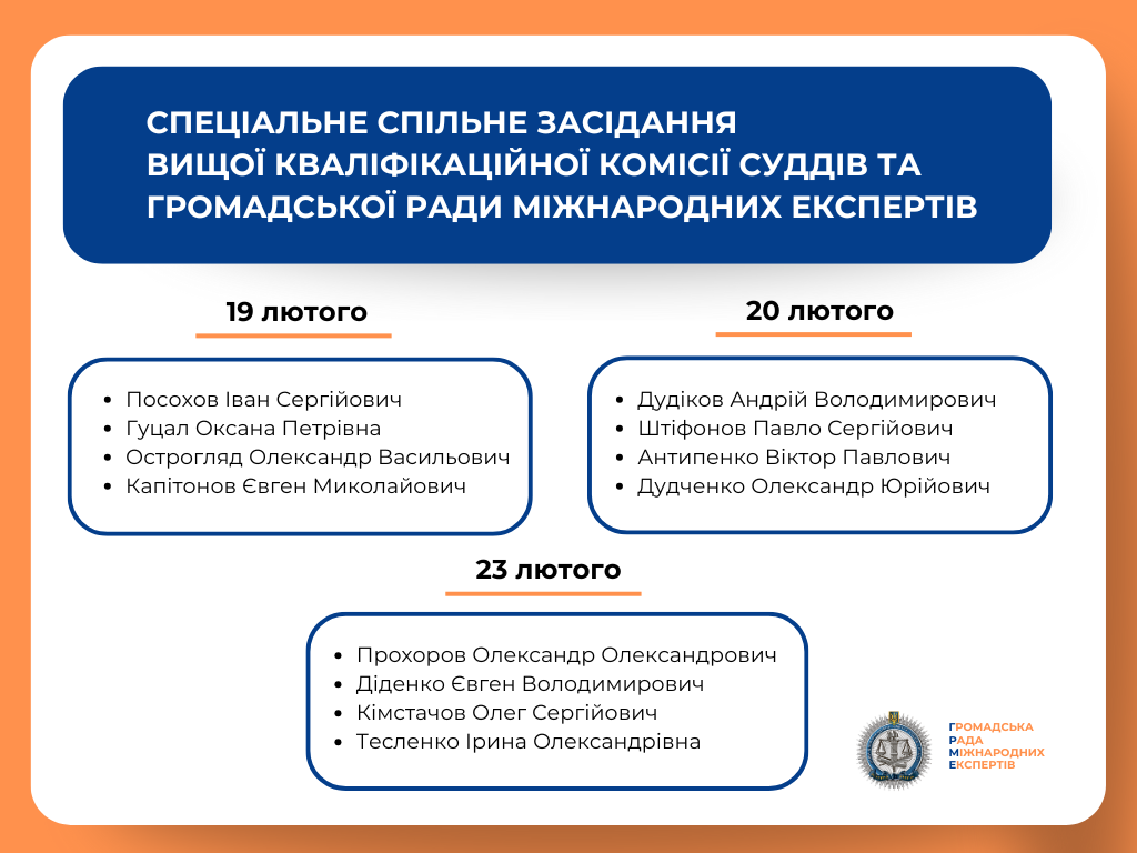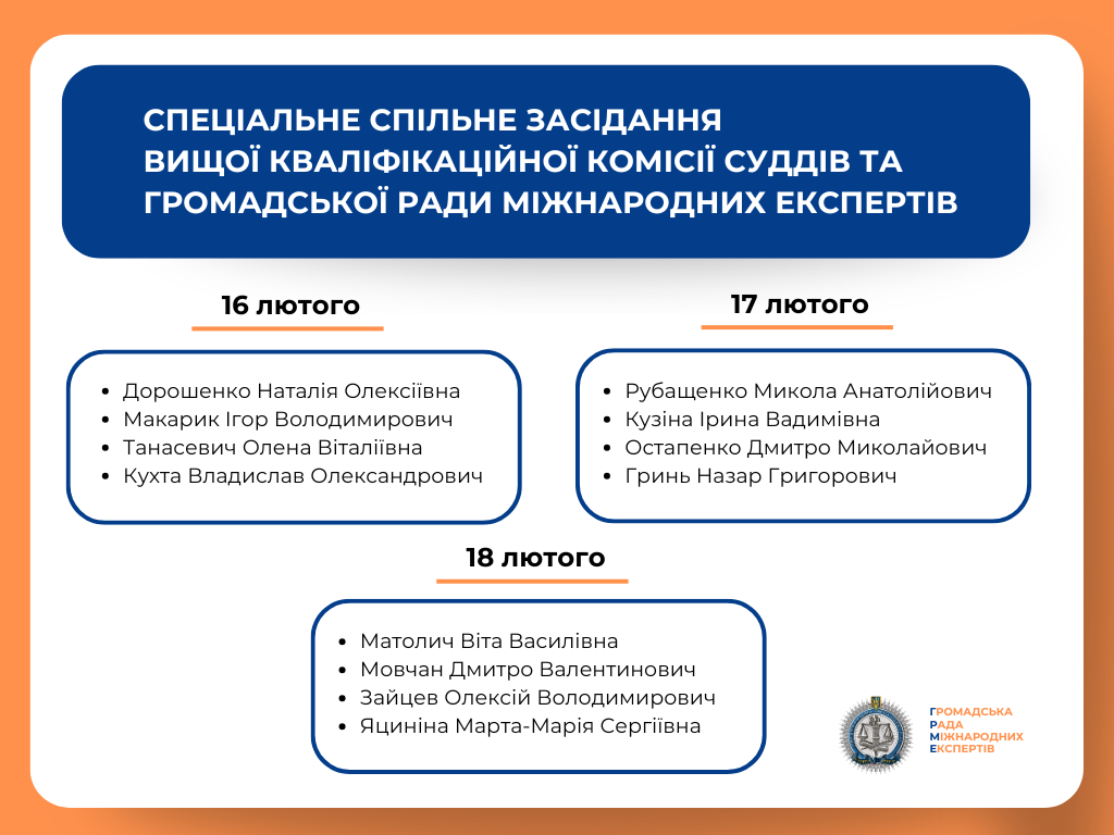 З 16 лютого по 17 березня 2026 року Громадська рада міжнародних експертів спільно з Вищою кваліфікаційною комісією суддів України проводитиме спеціальні спільні засідання в межах конкурсу до Вищого антикорупційного суду та його Апеляційної палати.